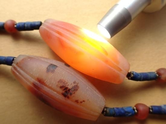マット仕上げのラピスラズリとカーネリアンのコンビネーションがアジアの王朝風でエスニックな雰囲気満点です。紐は湿気を含むと切れやすくなります。当社ではこうしたデリケートな製品の組直しはできません。組直しやこれらのパーツを使って新規ネックレスの制作ができる方にお勧めします。品質管理の行き届いた工業製品ではありません。品質の細かな欠点が気になる方向きの製品ではありません。一般的に染料で染色されていなくて、縞模様が少ない赤色系メノウないしカルセドニーをカーネリアンとよんでいます。