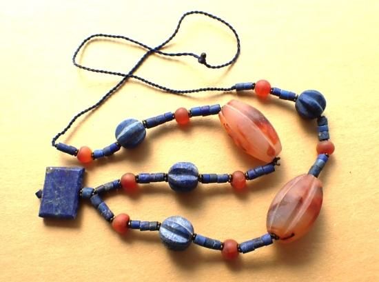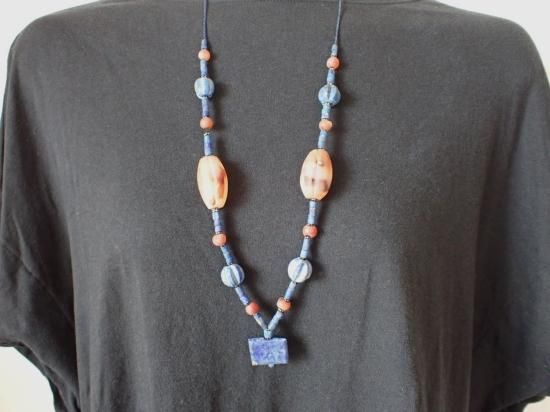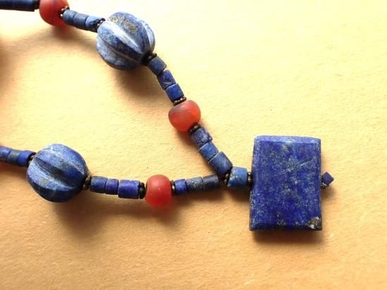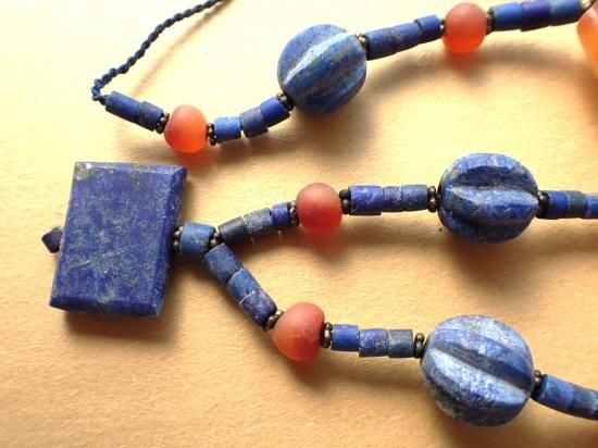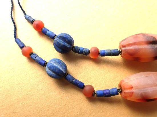サイズ:紺色の紐を含む全長約80cm、天然石部分は片側約23cm、カーネリアンビーズは約30x20mm。ラピスラズリはアフガニスタン産、無染色品。以前に在京していたパキスタンのディーラーから仕入れたネックレスです。アンティーク風にみえますが、紐の状態に使用感がないので新品と思います。