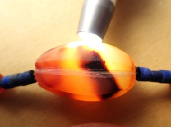 マット仕上げのラピスラズリとカーネリアンのコンビネーションがアジアの王朝風でエスニックな雰囲気満点です。紐は湿気を含むと切れやすくなります。当社ではこうしたデリケートな製品の組直しはできません。組直しやこれらのパーツを使って新規ネックレスの制作ができる方にお勧めします。品質管理の行き届いた工業製品ではありません。品質の細かな欠点が気になる方向きの製品ではありません。一般的に染料で染色されていなくて、縞模様が少ない赤色系メノウないしカルセドニーをカーネリアンとよんでいます。
