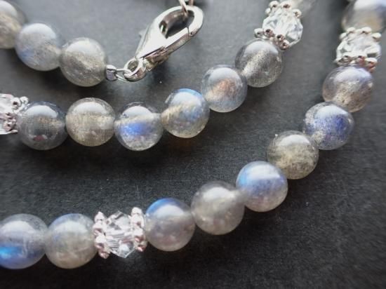 ラブラドライトはムーンストーンと近縁の天然石、ラブラドレッセンスといって黒っぽい石肌のあちこちに青や緑、黄色の閃光がわきたつ特徴があります。ビーズの場合は蛍が光をともしたように見えます。ラブラドライトは自信を増幅する働きが強いパワーストーン。気持ちがゆらぐとき、自分に自信をもって前向きに取り組めるよう手助けしてくれます。