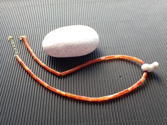 サイズ:日本翡翠勾玉20mm白系(\3,500)、カーネリアン管玉4x6mm、全長約41cm。金色カニツメクラスプ、5cmアジャスター。ネックレスは5割引、勾玉は2割引。管玉は円柱形で角があります。丸玉ビーズのように曲げられません。