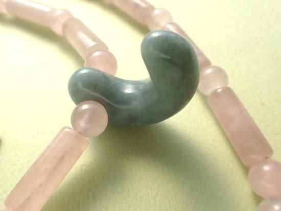 サイズ:ロシア産翡翠勾玉30mm5個(1個\5,800)、ローズクォーツ管玉約19x7mmと8mm丸玉、全長約70cm、金色カニツメクラスプ。お好みの貴金属のクラスプに交換するといっそう豪華なネックレスになります。使用している勾玉は色調の整った美しい緑色をしています。神前に端座して神祭りする神道や修験道の修行者に役立つよう制作しました。一般の方むけのアクセサリーではありません。