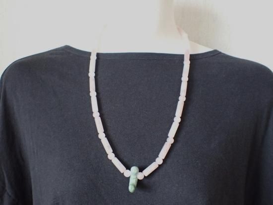 サイズ:ロシア産翡翠勾玉30mm1個(1個\5,800)、ローズクォーツ管玉約19x7mmと8mm丸玉、全長約60cm、金色カニツメクラスプ。 お好みの貴金属のクラスプに交換するといっそう豪華なネックレスになります。使用している勾玉は色調の整った美しい緑色をしています。神前に端座して神祭りする神道や修験道の修行者に役立つよう制作しました。一般の方むけのアクセサリーではありません。