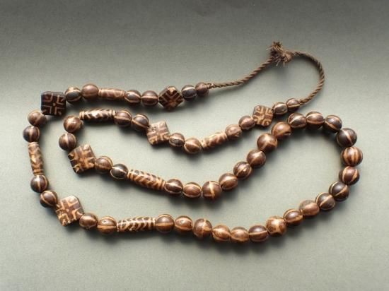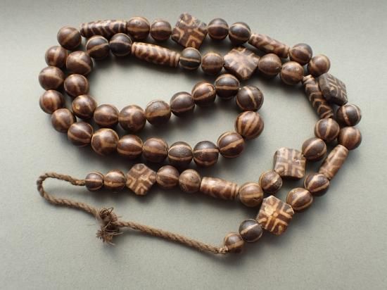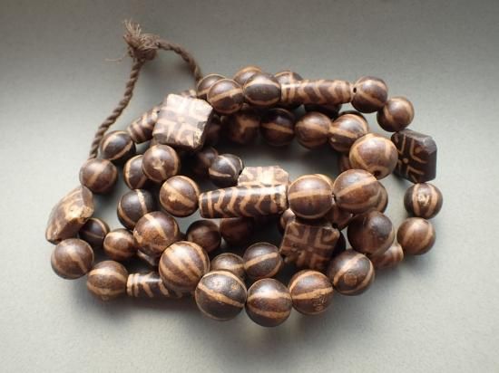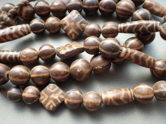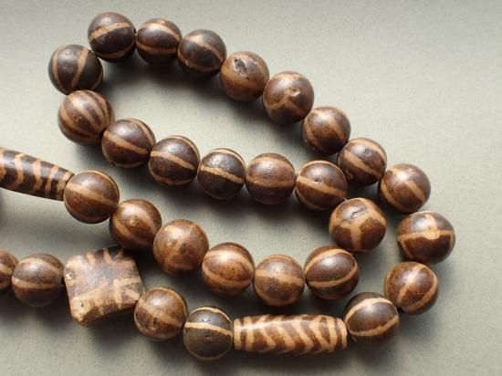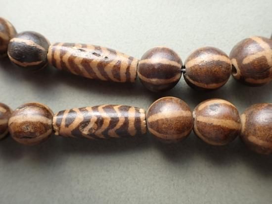 パムテックビーズは椰子など木の化石を素材にジービーズ(西蔵天珠)と同じ技法で作られています。おもにヒマラヤ山脈の東方、ミャンマーの山岳民の間で、不運・災難を避ける魔法のビーズとして愛用されています。パムテックビーズは制作後長い年月が経過しています。素材の性質上小さな欠けや傷がありますが不良品ではありません。あらかじめご理解ください。