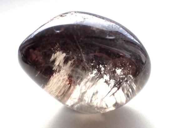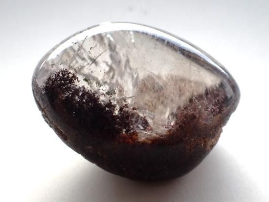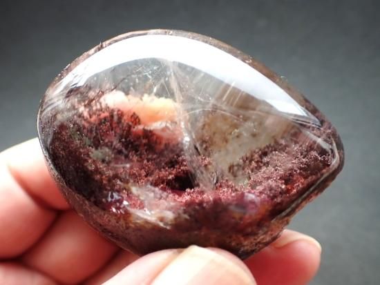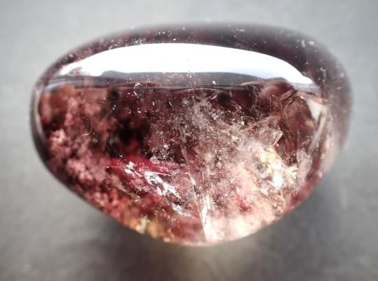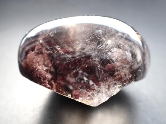 サイズ:約56x43x35mm、106g。 ドーム状に丸磨きされた底面の方に、酸化鉄系統と思われる顆粒状鉱物が密集しています。いっぱんに顆粒状のメノウ(白っぽい)やクローライト(緑泥石)、ゲーサイト(針鉄鉱)などが内包されていたり、底のほうに堆積して、箱庭的な景色のようにみえる水晶をガーデンクォーツとよんでいます。眺めていると瞑想気分へと入っていけます。