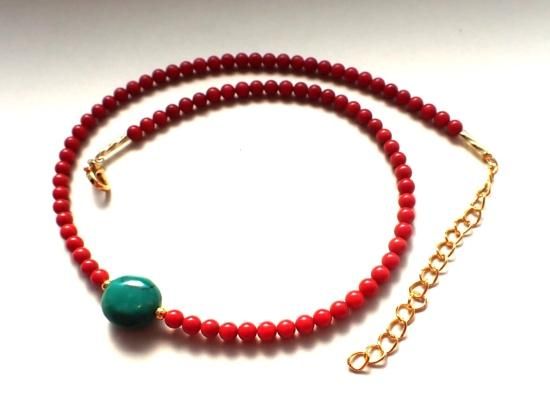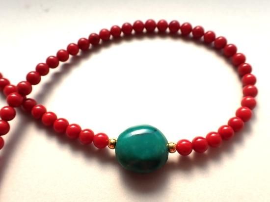 サイズ:全長約40cm。バンブーコーラル4mm玉にターコイス・ナゲットビーズ約13x13mmを組んであります。金色カニツメクラスプ、5cmアジャスター。パワフルで可愛いネックレスです。