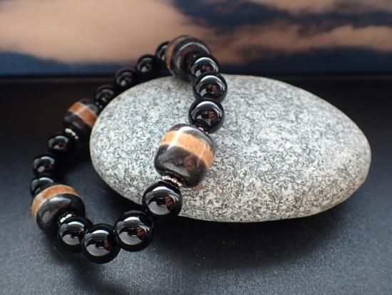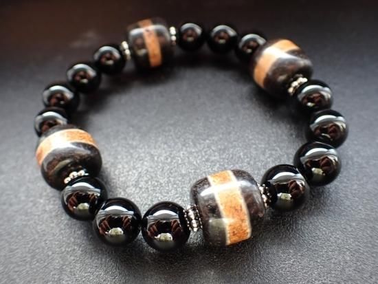 サイズ:西蔵天珠単線約14x13mm、オニックス10mm玉、ブレスレットの内径約16cm。オペロンゴム結び。古めかしい作りのチョンジー(線珠)単線を4個使用したブレスレットです。単線はジービーズ(西蔵天珠)の単眼と同じで、解釈のひとつでは如来の慈悲をあらわすとされていて、私たちが辛い目に遭わないようみまもってくれるといわれています。目的にむかって真っ直ぐ進んでいく力をさづけてくれます。在庫数3点、写真とほぼ同じ製品をお送りします。