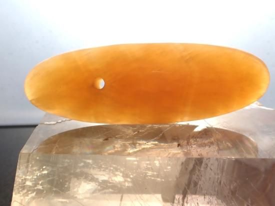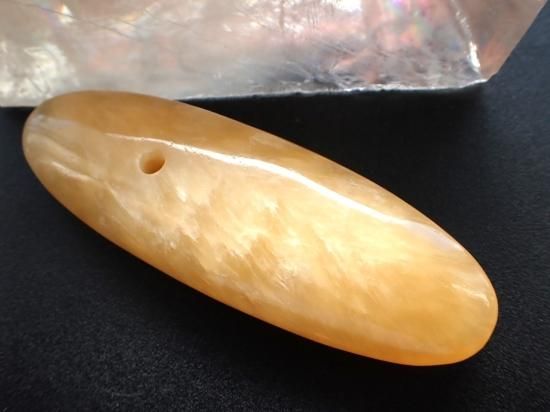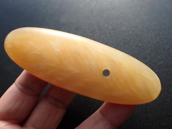 イエロージェードは蛇紋石や大理石の仲間の鉱物です。大理石や蛇紋石、寿山石などは、乾燥して水気を失ったように感じられるときがあります。このような場合はごく少量のベビーオイルを指につけて、製品をマッサージすると、石が元気よさを回復します。この製品は染色してあるかもしれません。最後の写真は紐をつけた場合のイメージ写真です。製品に紐は付属していません。