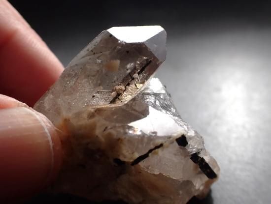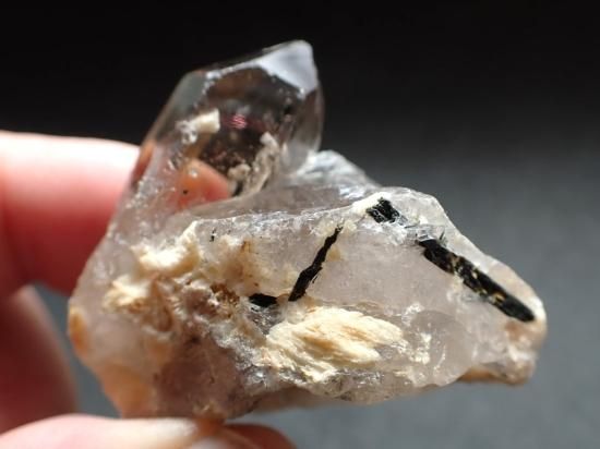 サイズ:約40x35x22mm、31g。当社コレクションルームで大切に保管してきた標本類からゴルフボール大の可愛い原石をえらんできました。パキスタン産で長さ35mmほど、淡い茶水晶ポイントのなかに約15mmの長さのショール(ブラックトルマリン)が内包されています。母岩の側にもショールが付いています。愛らしい標本です。