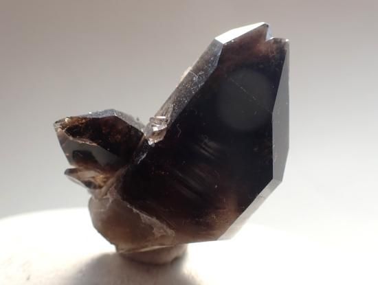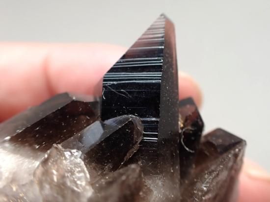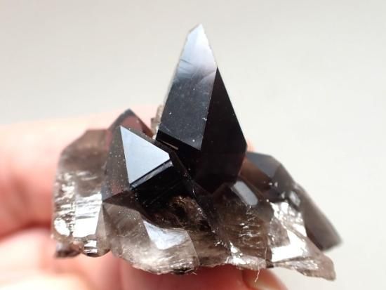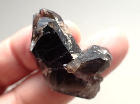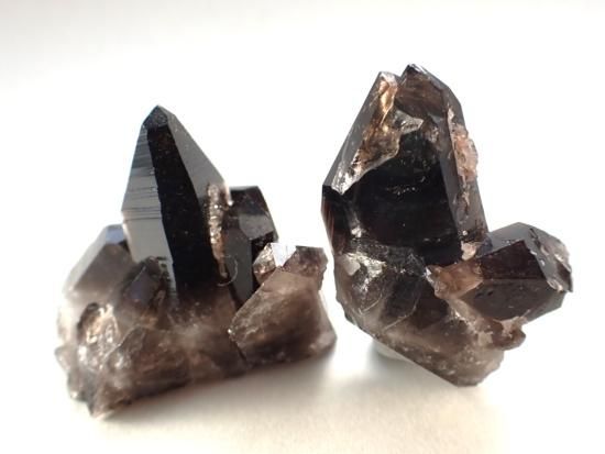 サイズ:約33x26x10mm、9g。31x27x26mm,15.6g。アメリカのアーカンソーは透明度の高い水晶の産地、以前はここの鉱山で採集された小型水晶を放射線処理して黒水晶にしたものが流通していました。当時の名残のアーカンソー産小型黒水晶の2個セットです。小サイズのほうは2つのポイントの角度が90度に近いので日本式双晶であるかもしれません。