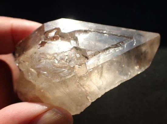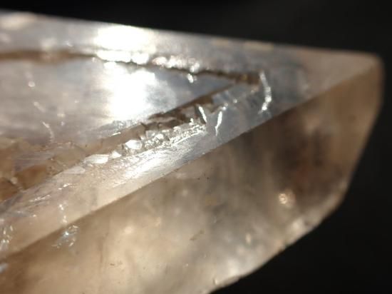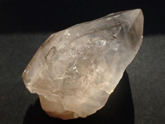 無染色未処理の原石です。エレスチャルの多くは、先にできた水晶原石に付着したり、覆うような形で結晶を成長させます。ひとつの原石上に板状ダブルポイントが多数発達したものは、平行連晶とよばれています。真冬に急激に気温が低下すると、何層にも重なって氷が張る場合があります。同様にケイ酸分の濃い地下の熱水中で、水晶が短時間に結晶すると、成長にゆがみが生じて層状になる場合があるといいます。想像しにくいけれど、こうしてエレスチャルができます。エレスチャルにはスピリチュアルな領域へ意識をいざなう効力が高いように見受けられます。