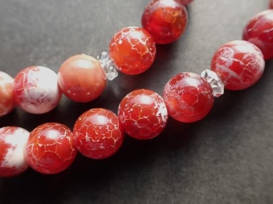 サイズ:10mm玉、水晶ファセットカット6x3mm、全長約40cm。止め金は銀色カニ爪クラスプ、5cmアジャスター。華やかでありながら派手になりすぎないよう胸元を飾ってくれます。火炎メノウはレッドアゲートをベースにジービーズ(西蔵天珠)に模様を描くのと同じ方法で白色の模様が加えられています。護摩供養の火炎に見立てて火炎メノウと呼ばれています。紅白の色合いは魔を退散させる辟邪の色とされていて、縁起のいいビーズです。5割引価格はブレスレット1本と同じ価格なので大変お得です。