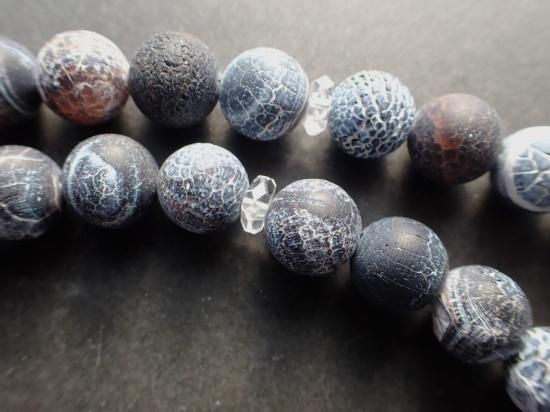 サイズ:10mm玉、水晶ファセットカット6x3mm、全長約41cm。止め金は銀色カニ爪クラスプ、5cmアジャスター。風花(かざばな)メノウは紺色のメノウを特殊処理して細かな凹凸模様をつけ、藍染めの味わいを演出しています。とても珍しい製品で20年ほど前に一度みたきりです。藍染めファンには見逃せないシックで趣味のよさがひき立つネックレスです。5割引価格はブレスレット1本と同じ価格なので大変お得です。