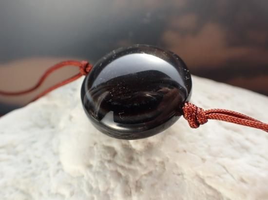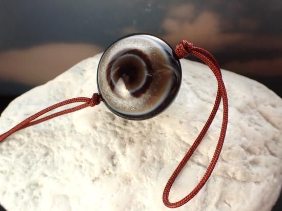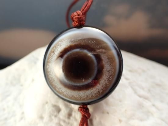 サイズ:約30x17mm。天眼ビーズと同様にチベット産メノウの天然の模様を生かして製作されています。羊の眼を連想させる羊眼天珠の一種とされています。如来の加護を得て願望成就できるよう働きかけてくれます。紐を外してペンダントなどに加工できます。