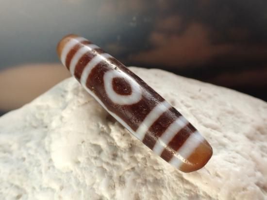 サイズ:約58x14mm。3眼天珠は如来の第三の眼を象徴するジービーズで、天の加護、地の利を得られることから、事業の成功、蓄財に効果が高いとされています。3眼のなかで眼のデザインが細長いものを仏眼3眼と呼んでいます。