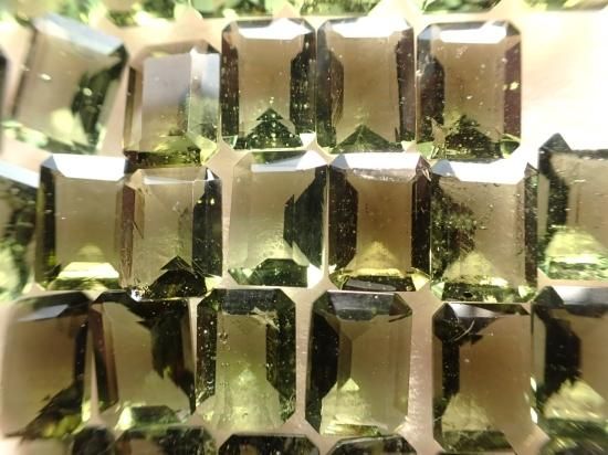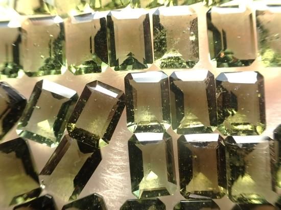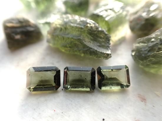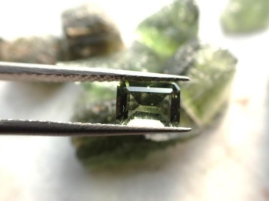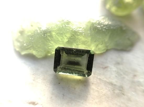 サイズ:約5x7mm、ステップ・カット。お送りするルースは1個です。写真の原石類は製品に付属していません。写真のルースとほぼ同じ製品をお送りします。チェコのモルダバイト鉱山から原石を直接仕入れて、当社指定の工場でカットしました。本物のモルダバイト製品です。安心してお求めください。在庫数40個。
