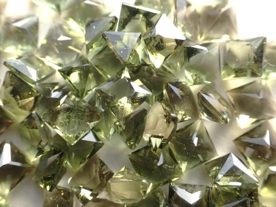 モルダバイトはおおきな隕石の落下・衝突により地上物質が瞬時に溶解、上空へと吹き上げられ、空冷されて、ごく短時間のうちに凝固した天然オブシディアンです。そのため透過光でみると多数の気泡があることがわかります。気泡がカット面にでていて極微の窪みとなっている場合もありますが、製作上の傷ではありません。