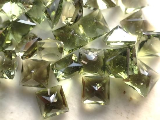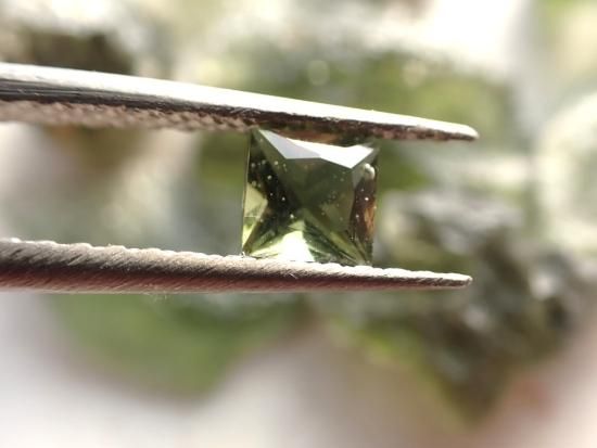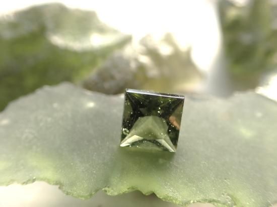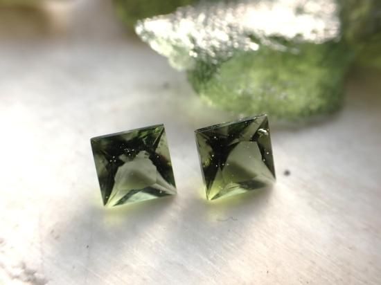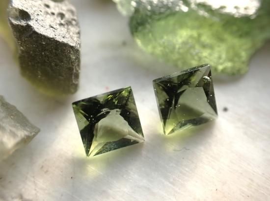 サイズ:長さ約4mm、スクエア・カットのルースの2個セットです。1個の小売価格2,800円を値引きして、さらに5割引のアウトレット価格です。写真の原石類は製品に付属していません。写真のルースとほぼ同じ製品をお送りします。チェコのモルダバイト鉱山から原石を直接仕入れて、当社指定の工場でカットしました。本物のモルダバイト製品です。安心してお求めください。写真は拡大してあるため気泡が目立ちますが、実物ではあまり気になりません。在庫数30セット。
