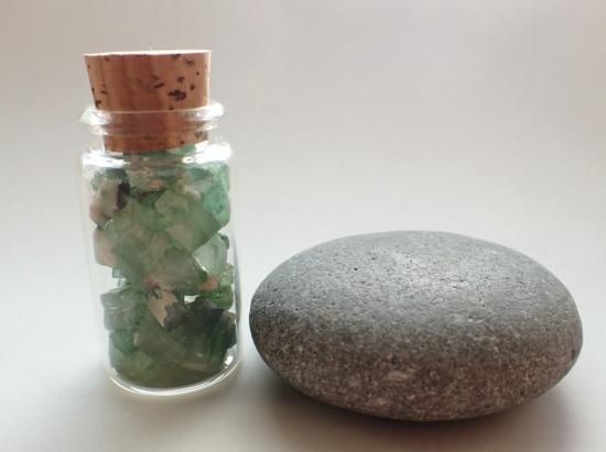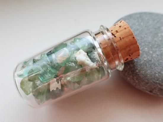 サイズ:約5-10mm、ガラス小瓶を除いた本体約25g。パキスタン産。グリーン系のトルマリンを中心にピンクなどが混ざった小粒トルマリンを、ボールに盛った野菜に見立ててサラダトルマリンとよんでいます。愛称通りに愛らしいトルマリン・セットです。結晶が柱状で、柱面に条線のあるものをエルバイトとよんでいます。リチウムを含むトルマリンです。ピアスなどアクセサリーの素材として使用できるものも含まれています。