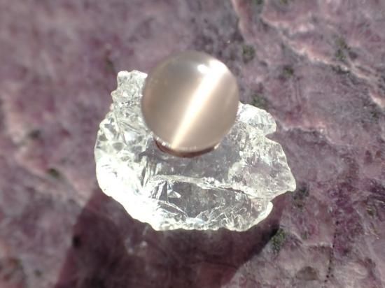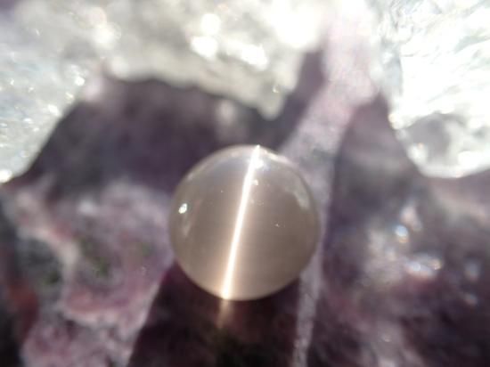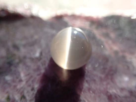 サイズ:約6.8x6.5x5.2mm、2.3ct。シリマナイトの和名はケイ線石。主成分はアルミニウム+ケイ酸で、繊維状結晶が平行に集合して塊状になることが多く、カボションカットするとまばゆいばかりに鋭いキャッツアイを持つルースができます。写真の原石はルースに付属していませんん。