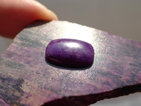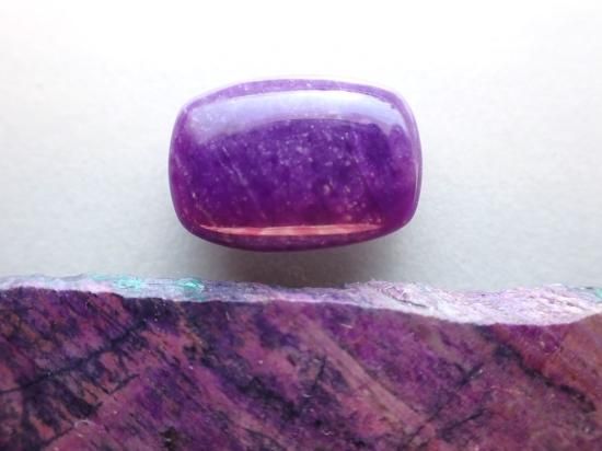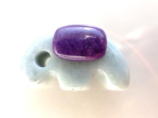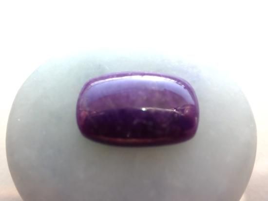 サイズ:約14x9.5x3mm、約4.7ct(多少のばらつきがあります)。南アフリカ産ジェムグレードのスギライトのルースです。スギライトは3大ヒーリング・ストーンのひとつに選ばれ、人気の高い宝石ですが、紫色のきれいなルースをみかけなくなっています。スギライトがあまり知られていなかったころ、たくさんの原石を仕入れて、丸玉やルースを製作しました。久し振りにストックを開いて紹介する次第です。実物より拡大撮影してあるため、色むらがあるように見えますが、目視では紫色一色のまばゆいほどに美しく気品があるルースです。自社カット製品なので安価で提供しています。写真の獣型勾玉は