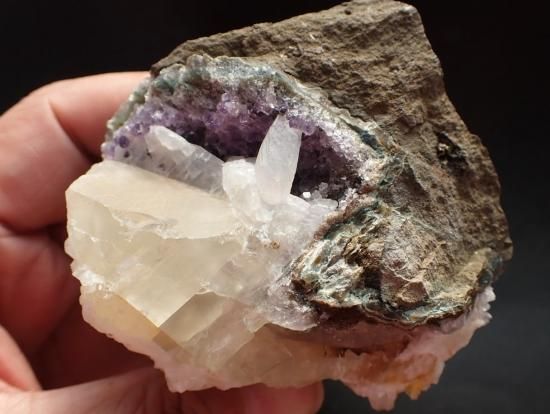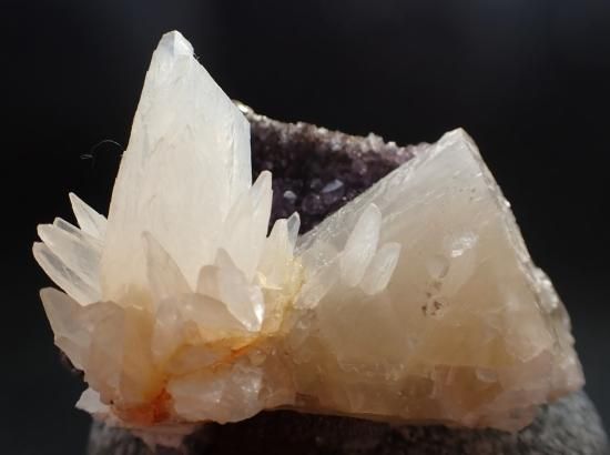 サイズ:約80x60x58mm、214g。ブラジル産。端正で愛らしい標本ですが、カルサイトの一部に接着跡があるのでお買い得価格にしてあります。移動中に分離したものと思われます。ブラジルやウルグアイ産アメシストにしばしば見かけますが、こうした原石はアメシストが析出した晶洞に、石灰石(カルサイト、炭酸カルシウム)を含む地下水が流入・浸透してくることで誕生します。アメシストができた時代と、カルサイトが結晶した時代と、ふたつの歴史が複合しています。