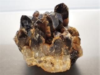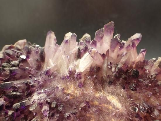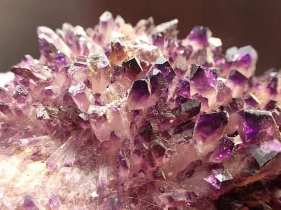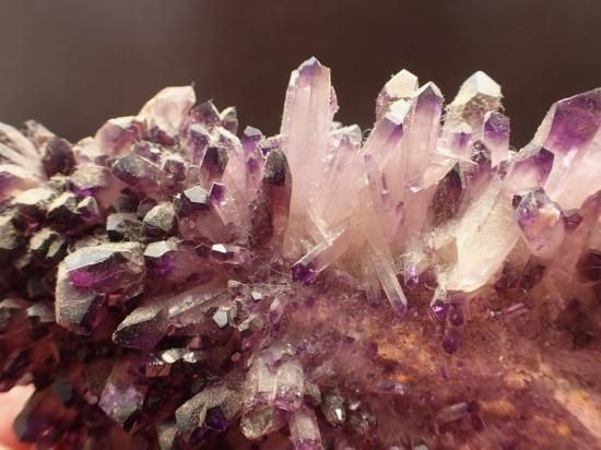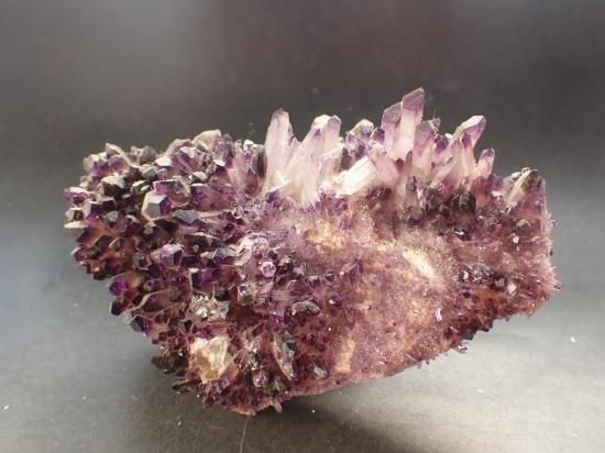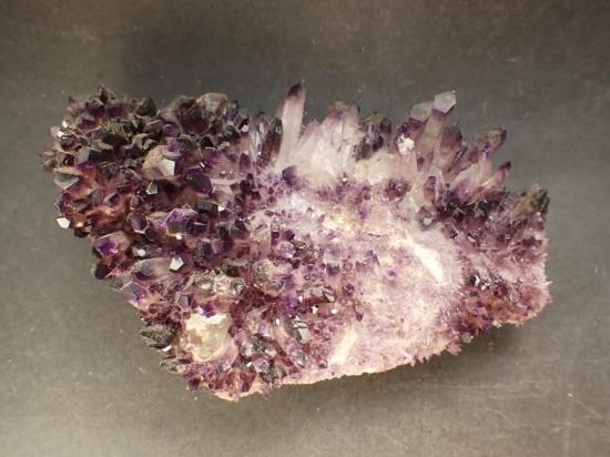 サイズ:約123x77x30mm、240g。水晶クラスターの上に、人為的に緑色薬物の結晶を育てて緑色水晶を作るなど、中国でお得意の技法で、天然アメシストに似た形状に仕立ててあるように思われます。参考資料として価値ある標本なので、当社倉庫に保管してきました。