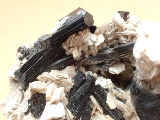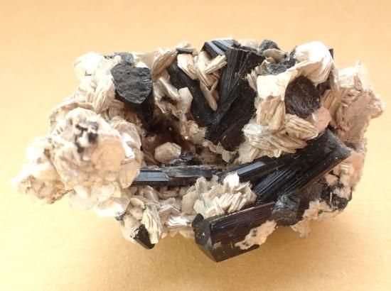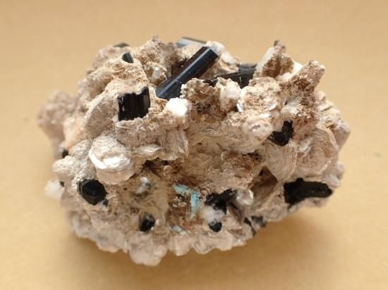 サイズ:約80x69x36mm、206g。旧25,000 ブラジル産。雲母が集合した母岩に小粒ながら形の整った黒色トルマリンがなん本も埋もれています、トルマリン・ファンなら見逃すことが難しい美品です。ルーペで見ると愛らしさに笑みがこぼれます。