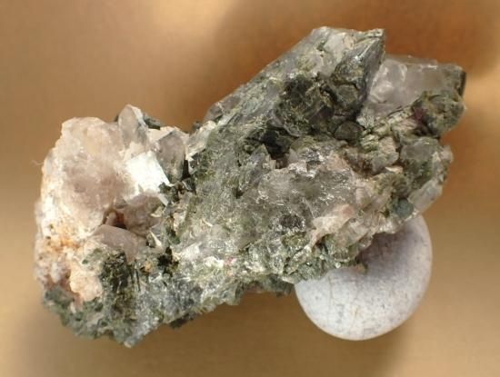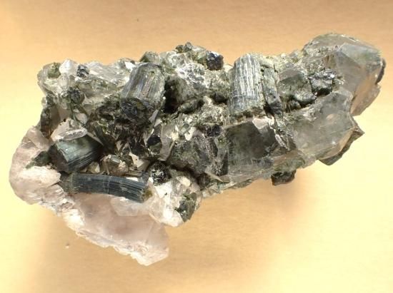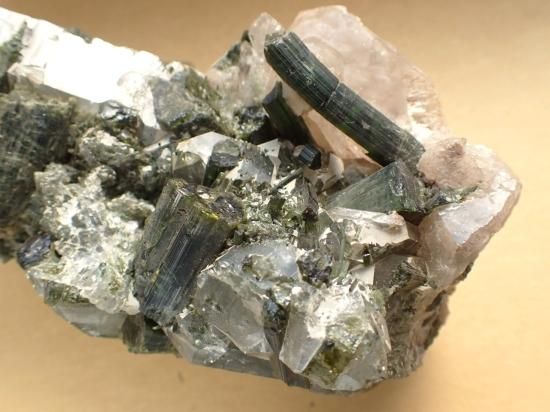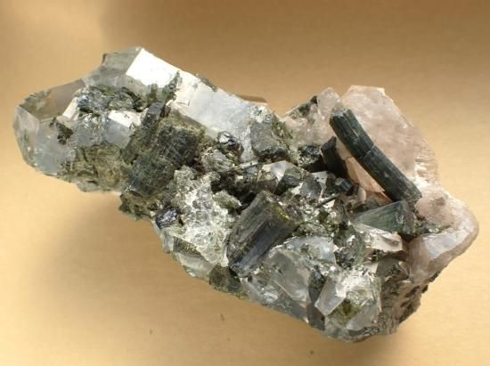 サイズ:約150x80x60mm、800g。ブラジル産。水晶とトルマリンが団子のようにくっつきあって大きな固まりになっています。一見すると一本の水晶ポイントにトルマリンが随伴しているような迫力があります。あふれんばかりのパワーについ怒っているように見えます。