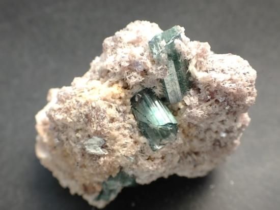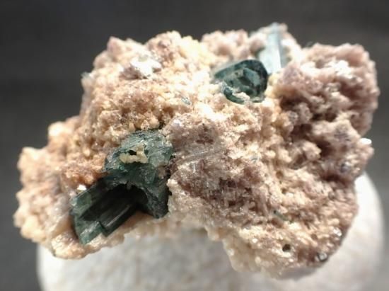 サイズ:約47x35x30mm、45g。ブラジル産。トルマリンの大棚ざらえをはじめました。顆粒状の雲母のようにみえる母岩に数本のグリーントルマリンが埋もれています。