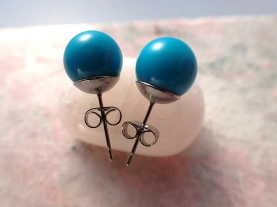 サイズ:約10mm玉。銀色。ルースはアメリカ産、ジェム・グレードのターコイス丸玉(片穴)。金具に医療用サージカル・ステンレス使用しています。金属アレルギーの心配の少ないイヤリングです。パーツを仕入れて新規製作しました。製品の性質上、返品に対応できません。在庫数は2ペアですが売り切れ後に再製作の予定でいます。低予算で本物の天然石を愛用できます。