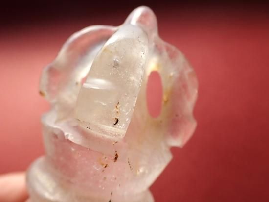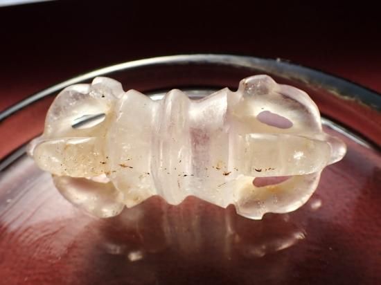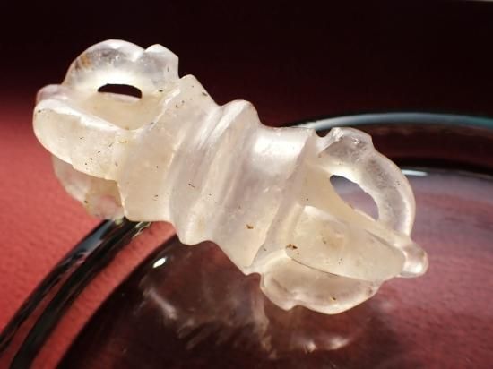 サイズ:約95x38x30mm、90g。ネパールの天然石彫刻家が自国産ヒマラヤ水晶原石から彫刻したヴァジュラ(金剛杵)です。中心軸を加えて5本刃があるものを五鈷とよんでいます。無傷製品ではありません。
