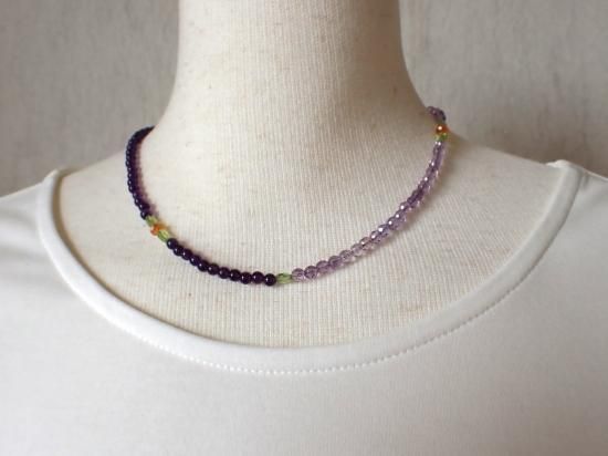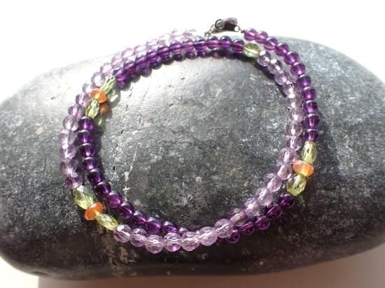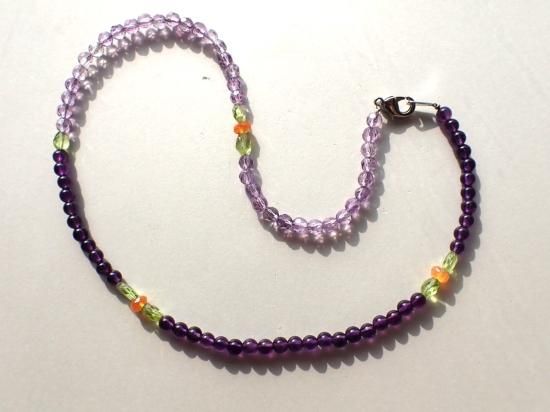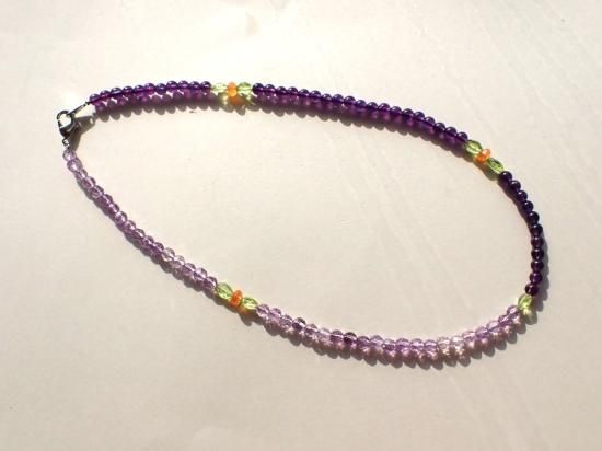 サイズ:クラスプ込みの全長約39cm、ステンレスワイヤー結び。銀色カニツメ・クラスプ。ビーズの半数をアメシスト4mm玉、残る半数をアメシスト・ファセット4mm玉で結んでいます。他にペリドット、カーネリアン。