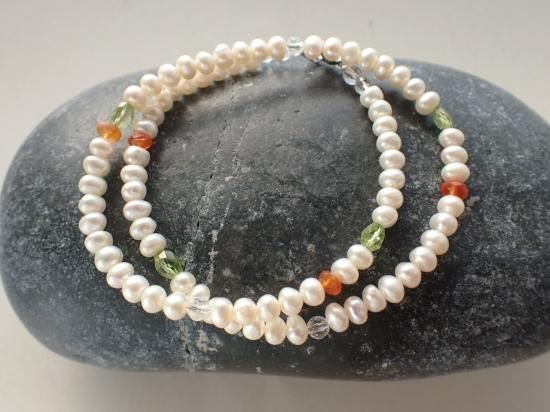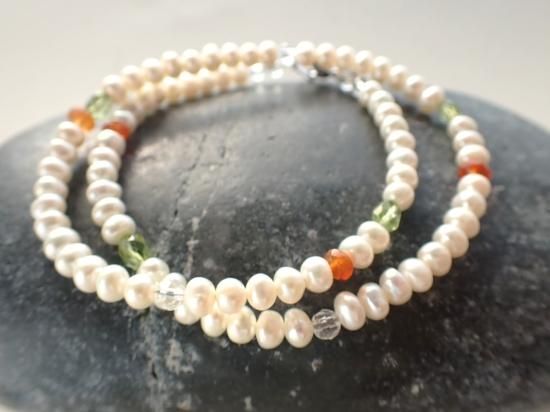 サイズ:クラスプ込みの全長約39cm、ポテトパール4mm、他にペイドット、カーネリアン、水晶丸ファセット。ステンレスワイヤー結び。銀色カニツメ・クラスプ。2連のブレスにすると2種類のブレスを付けているように見えます。