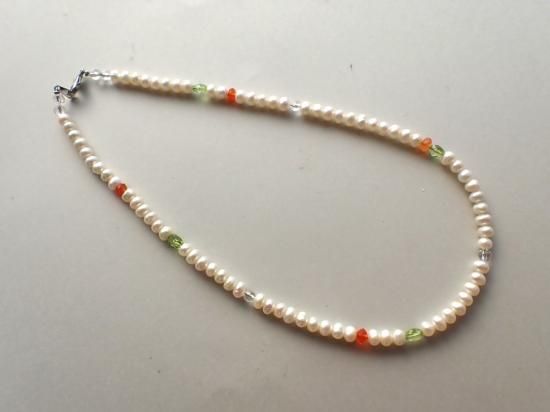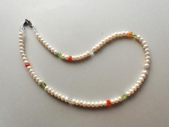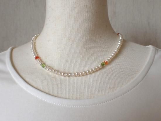 ポテトパールは偏平ぎみで円形の湖水パールの愛称です。色艶は海の養殖真珠同様ですが安価です。パール・ネックレスは天然石を組み合わせるとカジュアルになります。写真の品売り切れ後はほぼ同じ製品を製作してお送りします。