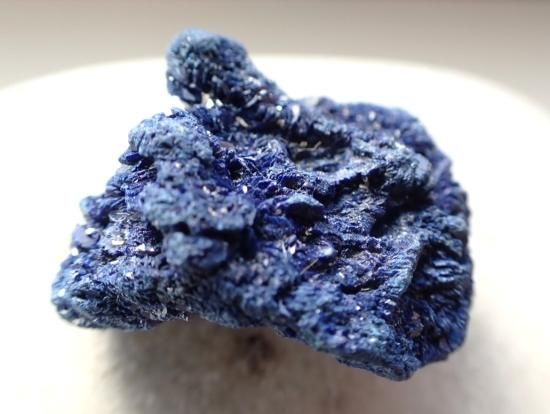 サイズ:約25x20x16mm、8.6g。 モロッコ産で不純物の少ない高品位のアズライト原石です。細かく砕けば顔料になります。アズライトはマラカイトと同じ成分からなっていて、銅製彫像に緑青が浮くように成分の銅が炭酸ガスと反応してマラカイトに変わっていきます。