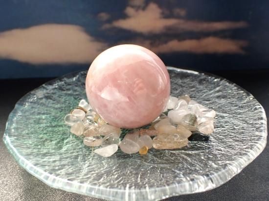 サイズ:直径約45mm、124g。 ブラジル産ローズクォーツ丸玉です。写真の製品をお送りします。無傷ではありません。玉台は付いていません。小皿などに飾った場合丸玉が安定するよう「さざれ石50gセット」を特別サービス品として同封します。写真の原石や皿は付属していません。