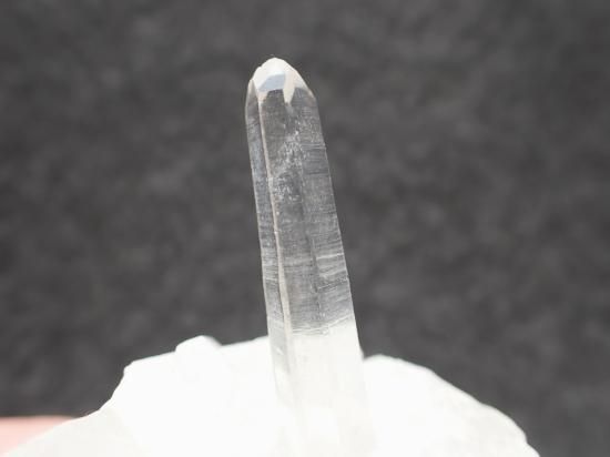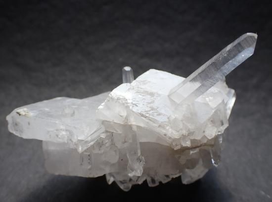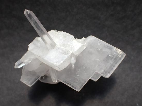 サイズ:約88x49x42mm、207g。中国四川省産。四辺形を重ねたような重晶石のベースから水晶ポイントがつきだしています。人が作った美術品をしのぐ造形美です。おもに単行本などに写真を掲載するために保存してあったコレクションケースから持ち出してきました。