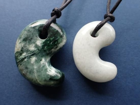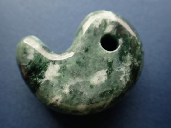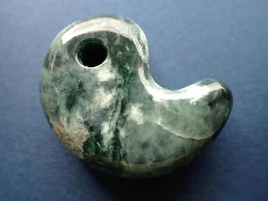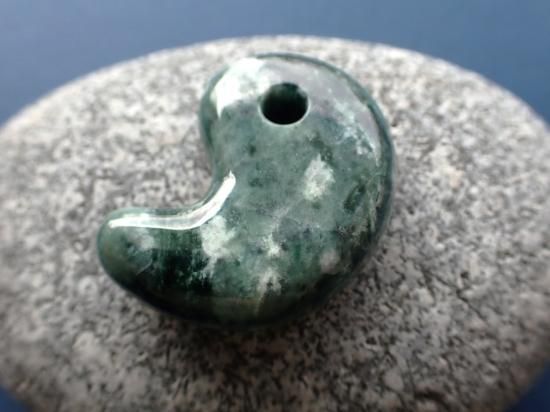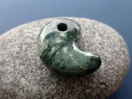 サイズ:約33x26x10mm。いろいろな色調の緑が重なり合った華麗な勾玉です。縄文時代の遺跡出土風勾玉のつもりだったのですが、現代風の仕上がりになっています。未染色未処理の糸魚川産翡翠原石(糸魚川ヒスイ)を使用してます。国内の加工業者にサンプル製作を依頼しました。実店舗閉店の時期と重なってしまったので、まとめての製作にはいたりませんでした。最後の写真はロービキ紐を付けた場合の見本です。いっしょに写っている30mm勾玉は製品に付属していません。