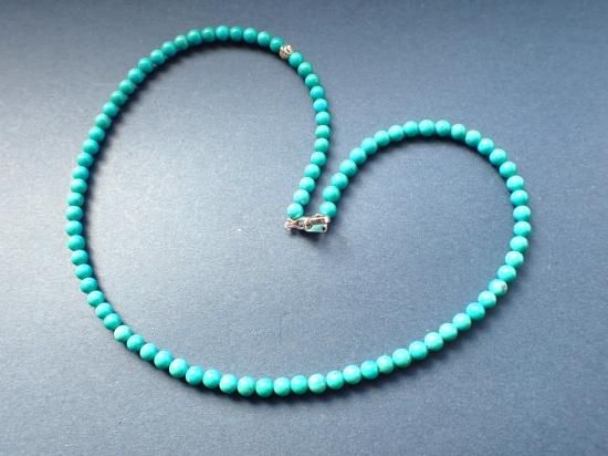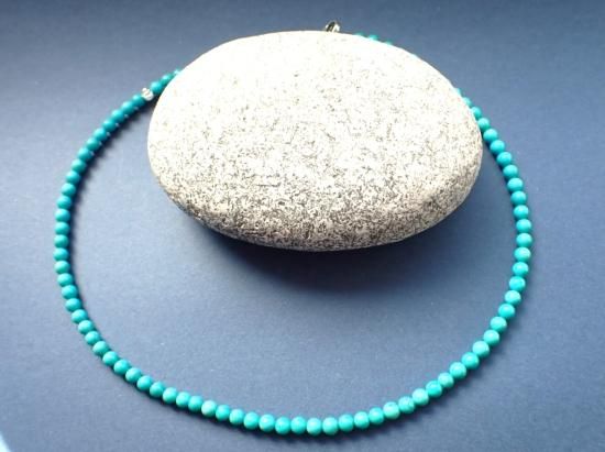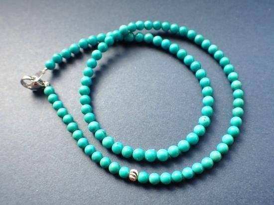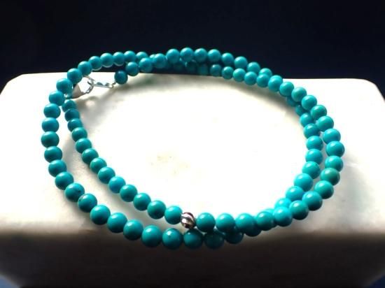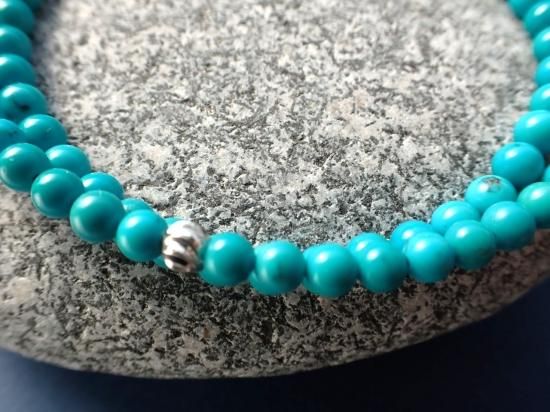 ハオライトの染色品ではなく、高品位のアメリカ産ターコイス原石から製作しました。2連のブレスレットまたはチョーカーサイズのネックレスになります。ターコイス(トルコ石)を愛用するといつも心の中に青空を宿せるようになり、気持ちのいい毎日をおくれます。