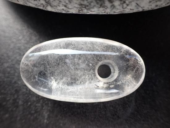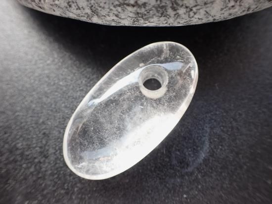サイズ:約35x18x10mm。パキスタンのカラコルム山系で採掘されたヒマラヤ水晶原石から制作した当社のオリジナル製品です。無傷ではありません。クラックやクラウドのある水晶は、撮影すると全体が傷だらけのように見えますが、透明部分の多い原石を使用しています。最後の写真はロービキ紐を付けた場合のイメージ写真です。