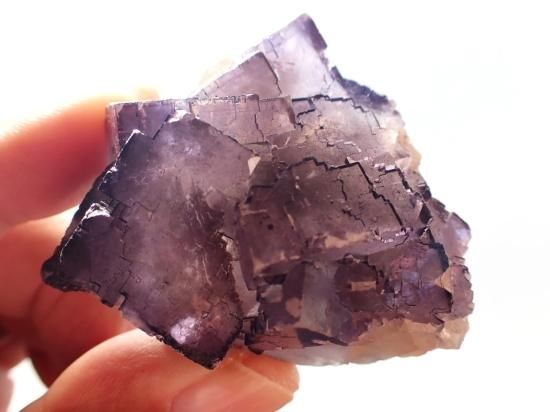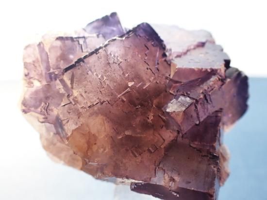 フローライトファンにはお馴染みのメキシコ産のパープルフローライトです。大小の四辺形が複雑に入り組んで、SF映画に見る都市の鳥瞰図のように見えます。強い透過光でみると、厚みが薄い箇所や縁(へり)の部分ではフローライトならではの鮮やかな紫色をみることができます。フローライトはカルシウムとフッ素の化合物、フッ化カルシウムの結晶。石灰岩地帯など比較的地殻の浅い部分で結晶するので、世界各地に産地があります。同じ分子組成なのに、地域によってそれぞれの個性があり、形状や結晶が異なるのがとても不思議です。写真の製品をお送りします。