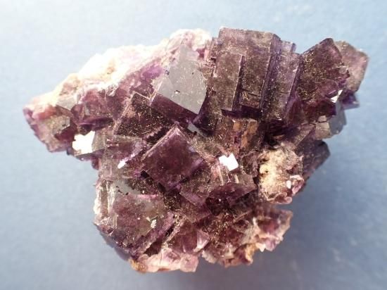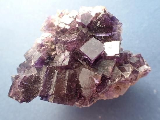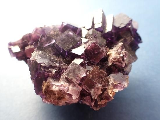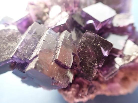 フローライトファンにはお馴染みのメキシコ産のパープルフローライトです。大小の四辺形が複雑に入り組んで、SF映画に見る都市の鳥瞰図のように見えます。強い透過光でみると、厚みが薄い箇所や縁(へり)の部分ではフローライトならではの鮮やかな紫色をみることができます。フローライトはカルシウムとフッ素の化合物、フッ化カルシウムの結晶。石灰岩地帯など比較的地殻の浅い部分で結晶するので、世界各地に産地があります。同じ分子組成なのに、地域によってそれぞれの個性があり、形状や結晶が異なるのがとても不思議です。写真の製品をお送りします。