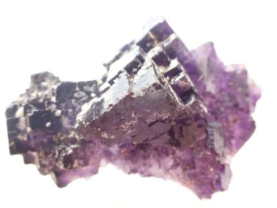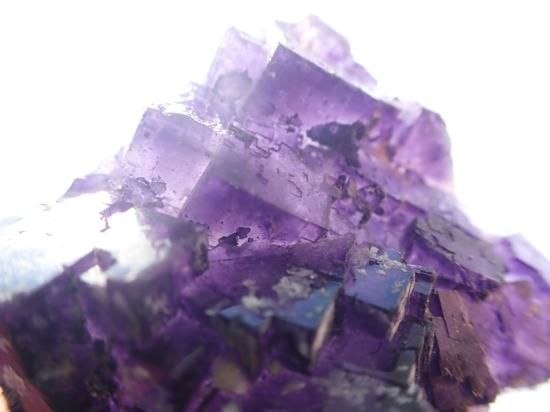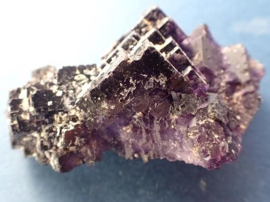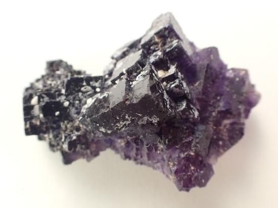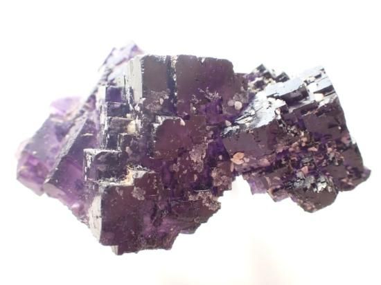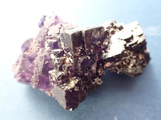 フローライトファンにはお馴染みのメキシコ産のパープルフローライトです。大小の四辺形が複雑に入り組んで、SF映画に見る都市の鳥瞰図のように見えます。強い透過光でみると、厚みが薄い箇所や縁(へり)の部分ではフローライトならではの鮮やかな紫色をみることができます。フローライトはカルシウムとフッ素の化合物、フッ化カルシウムの結晶。石灰岩地帯など比較的地殻の浅い部分で結晶するので、世界各地に産地があります。同じ分子組成なのに、地域によってそれぞれの個性があり、形状や結晶が異なるのがとても不思議です。写真の製品をお送りします。