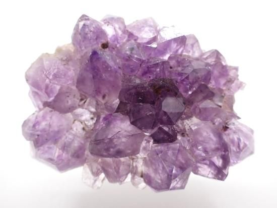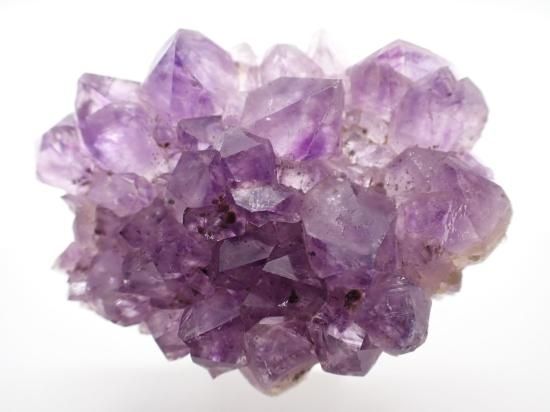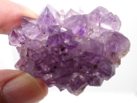 サイズ:約50x40x17mm、38g。ブラジル産と聞いていたのですが隣国ウルグアイ産と思います。地つづきの土地です。アメシストは濃い紫色で垂面だけが密集したブラジル産原石がよく知られていますが、アメシストは多種多様な鉱物、色合いは黒味の強いものから藤色・赤・茶・桃色・白など多岐にわたり、結晶の大きさも大小様々。これらの違いに注目するとサボテンなど特定ジャンルのアイテムを集めるのと同様、コレクションする楽しみを味わえます。鉱物たちの形や色の神秘さに魅了されると、アメシストやカルサイトの多様さに驚きあきれ、彼らのことをとても愛しく感じられるようになります。アメシスト・セレクトは当社で長の年月をかけて収集してきた変種のアメシストのコレクションです。