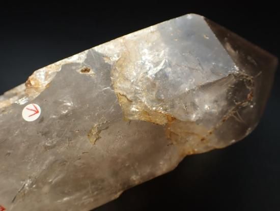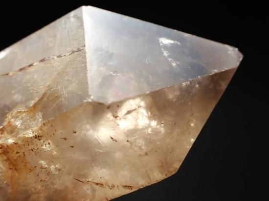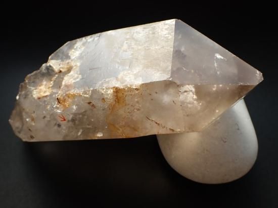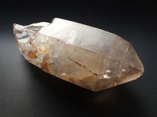 サイズ:約145x58x43mm、493g。ブラジル産。水晶生成時の地下水がチューブ状に封じ込められた珍しいポイントです。温度がさがったことで地下水に溶けていたガスが気化して、バブル(気泡)になっていて、ポイントを傾けたり、ゆすったりするとバブルがチューブ内部を動くので地下水の内包がわかります。このポイントではチューブがV字に入っているようで、バブルは消えたり出たりします。こうした標本はなかなか見つからなくて偶然の出会いを待つことになります。