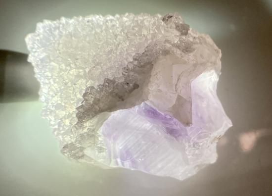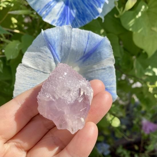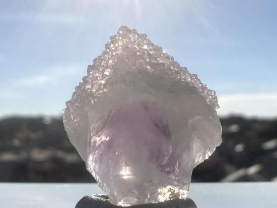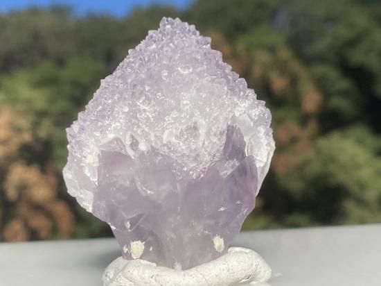 アメシスト結晶の上にアメシストの上にドゥルージー水晶(極小の水晶)が帽子のように乗っています。