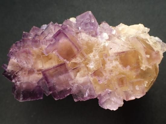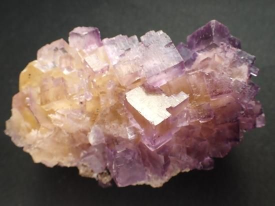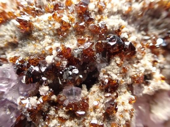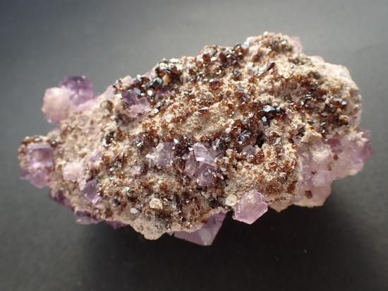 サイズ:約92x54x47mm、253g。メキシコ産。参考資料として保管してあったとっておきの製品を倉庫から持ちだしてきました。紫色と濃い黄色が混ざり合った風合いに気品があって、自分だけの宝物として秘蔵しておきたくなります。裏側にもキラキラと輝く小粒鉱物が多数析出しています。ルーペで観察するとガーネットのように見えます。フローライトとガーネットの共存はあまり聞いたことがないので別の鉱物とおもいます。安全にお届け出来るよう、ユウパックでお送りします。