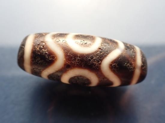 サイズ:約33x13mm。オーソドックスなスタイルの三眼天珠です。三眼は如来(仏)の第三の眼を象徴しています。過去・現在・未来を見通す眼であり、あらゆる苦しみを癒す慈悲のまなざしとされています。癒しの力が強く、病気や失敗からの回復を促すとされています。