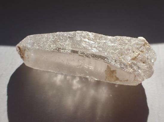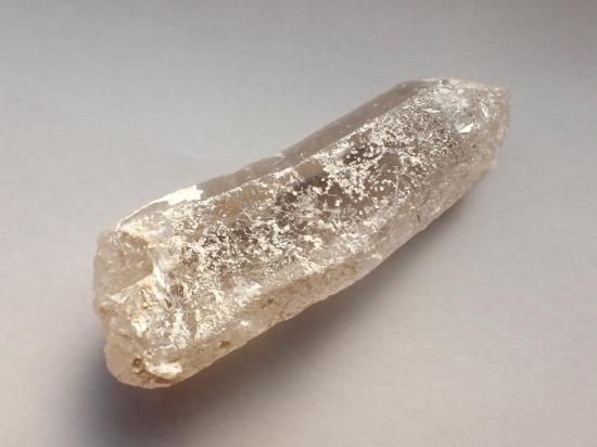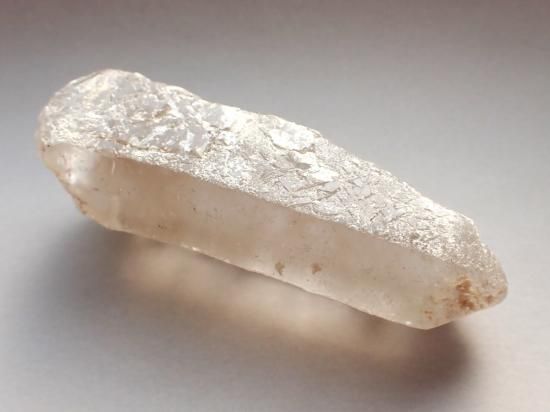 サイズ:約98x31x26mm、126g。ヒマラヤ山脈の西端、パキスタンのカラコルム山脈で採掘された水晶です。知人のパキスタン人ディーラーに、透明度が高く加工に適した水晶原石が欲しいと頼んだら、採掘した原石を無選別のまま大小取り混ぜて麻袋に詰めたものが届きました。20数年前のことで、最後まで残してあったのがこのシリーズです。水に濡らして太陽光に透かすと、内部の状況を確認できます。身辺の守護に、水晶ファンでなくとも持っていたい原石です。